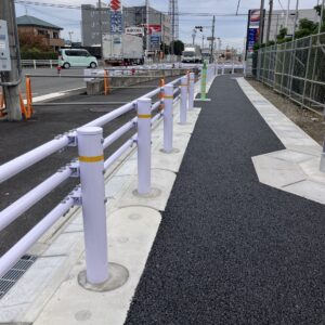 大口町地内155号線の道路拡幅工事において、当初は土中式で設置する計画であったが、地中に埋設物があり土中式を断念し、自在R連続基礎をご採用頂きました。